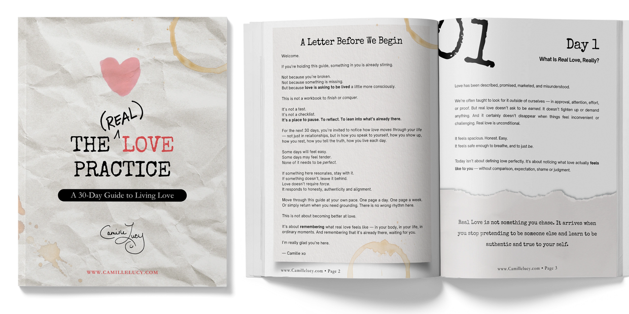 The Real Love Practice is a gentle, 30-day guided workbook designed to help you live love more honestly—in your relationship with yourself, with others, and with life as it is. It includes reflective passages, journal prompts, and simple daily practices you can return to at your own pace.